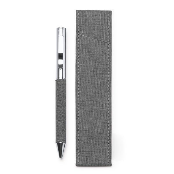 Twist ball pen in metal and RPET polyester. Blue ink. Presentation in a matching RPET polyester pouch.