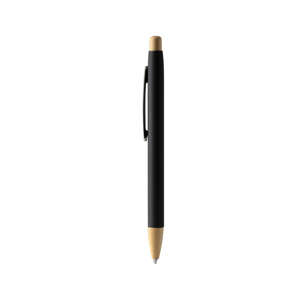 Rubber-finish metallic pen with push-button and bamboo details. Chrome-plated clip. Blue ink jumbo refill.