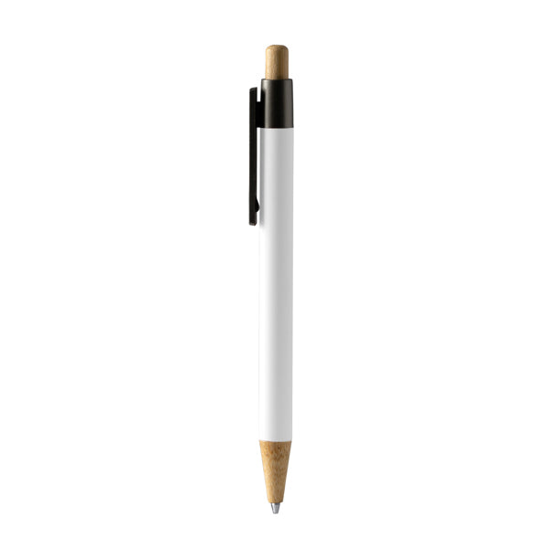 Rubber-finish metallic pen with bamboo push button and wide bamboo clip ideal for marking. Blue ink.