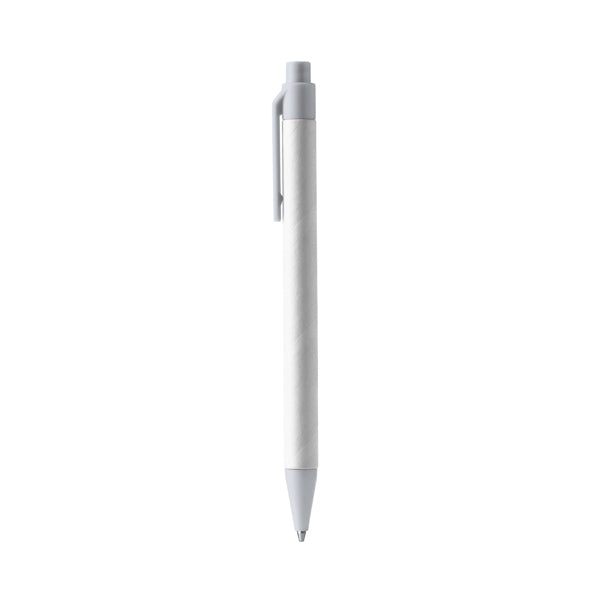 Rašiklis su mygtuku, perdirbto kartono korpusu, antgaliu ir spaustuku, pagamintu iš perdirbto ABS. Mėlynas rašalas.