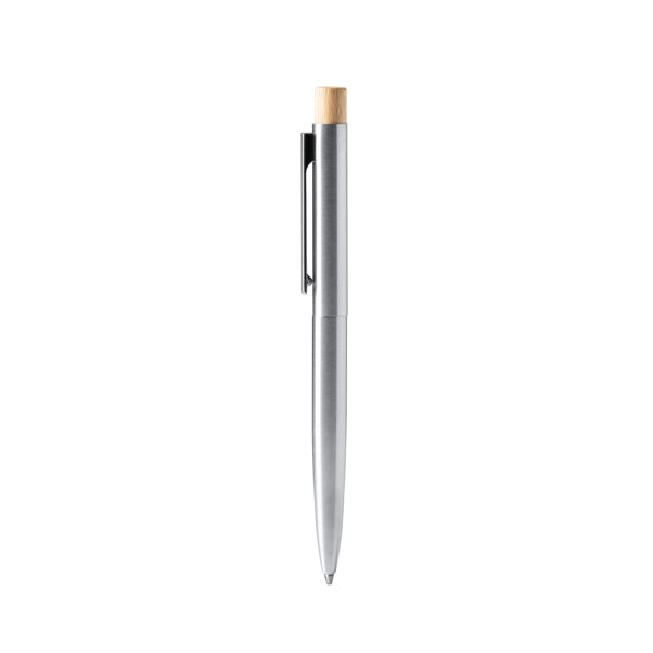 Ballpoint pen with recycled stainless steel body and bamboo push button. Blue ink jumbo refill. Presentation in individual kraft paper bag.