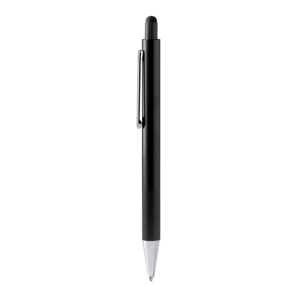 Aliuminis tušinukas su laikikliu su dryžuota metaline apdaila ir liečiamojo ekrano žymekliu. Didelis mėlyno rašalo papildymas.