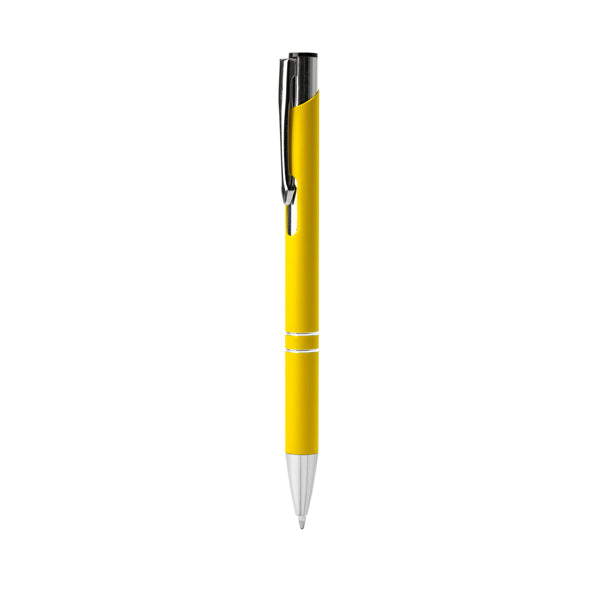 Ball pen with soft touch metal body and pusher with anodized finish. Tip, clip and details in chrome plated metal. Jumbo refill in black ink.