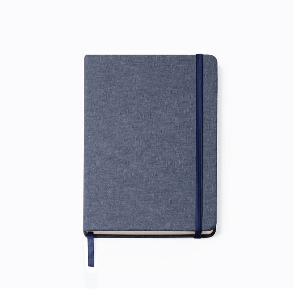 A5 notepad with cotton covers. Page marker and elastic band. 100 plain sheets.