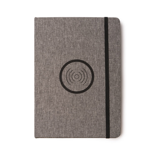 A5 formato užrašų knygelė iš RPET audinio su 15 W belaidžio įkrovimo paviršiumi mobiliesiems įrenginiams. Turi Type-C jungtį įkrovimui ir elastinį užsegimą.
