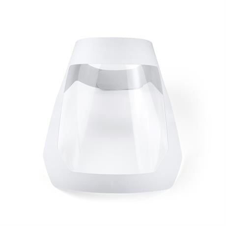 Flexible and lightweight reusable face shield, made of white laminated cardboard and PET. Easy to customize. Adjustable fastening with black velcro. Foam rubber padding for a comfortable fit to the forehead. Splash-proof design.