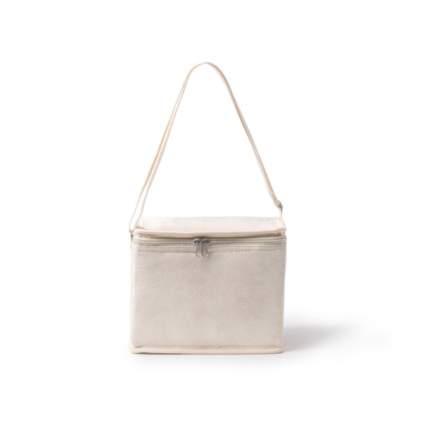 Cotton cooler bag with front pocket. Main pocket with isothermal lining. Carry handle included.