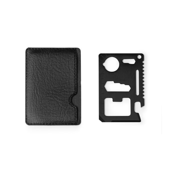 Stainless steel multi-tool with 11 in-built functions. Versatile tool that includes: a can opener, a sharp knife, a screwdriver, a ruler, a bottle opener, an adjustable spanner, a buttlerfly wrench, a saw for small tasks and a direction indicator. Presentation in a PU case.