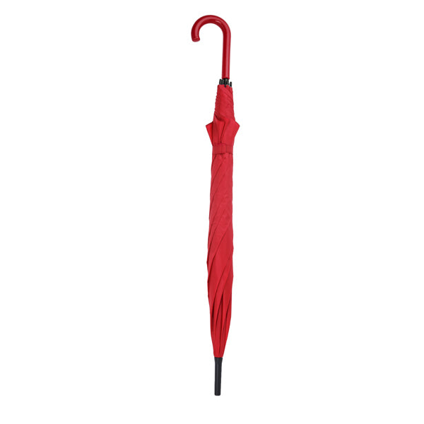 Umbrella with matching fabric and handle. Ribs and tips in black. Velcro fastening and auto-opening. 105 cm diameter.
