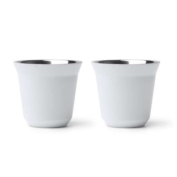 2 perdirbto 304 nerūdijančio plieno kavos puodelių rinkinys, matinės išorės ir veidrodinio efekto vidaus. Kiekvieno talpa – 80 ml.